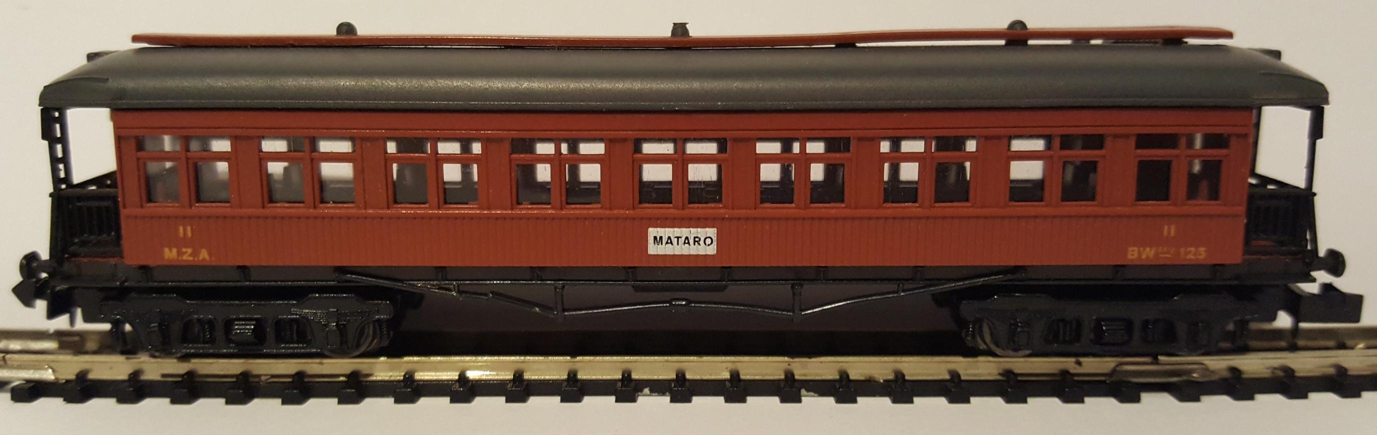 • Coche de madera de 4 ejes, de la compañía MZA, color marrón