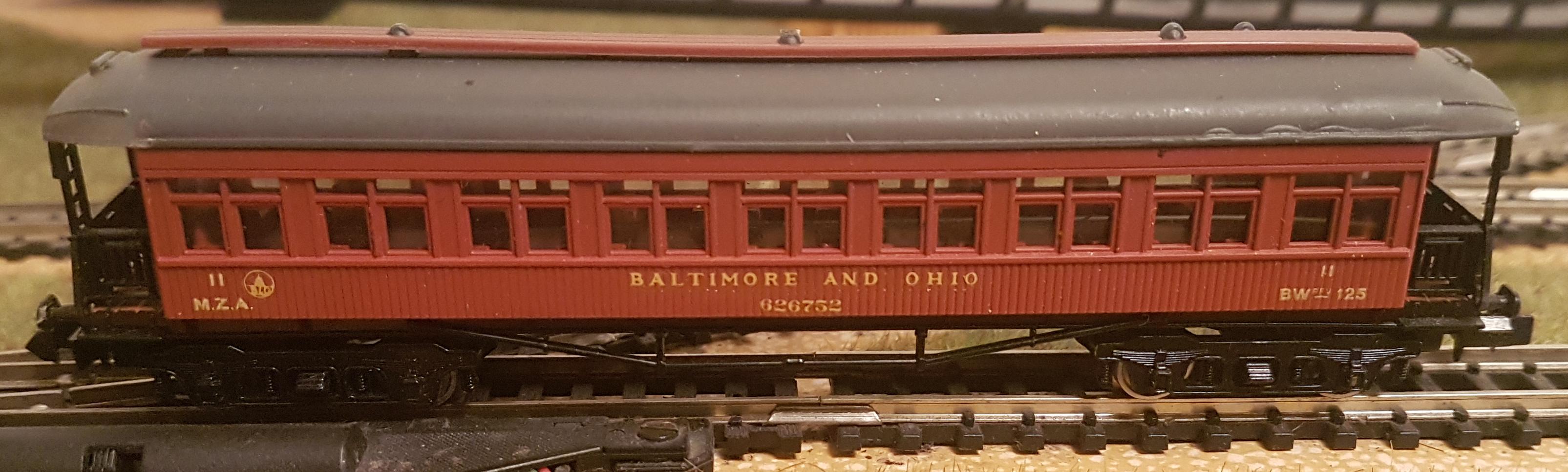 • Coche de madera de 4 ejes, de la compañía Baltimore and Ohio, USA, color marrón