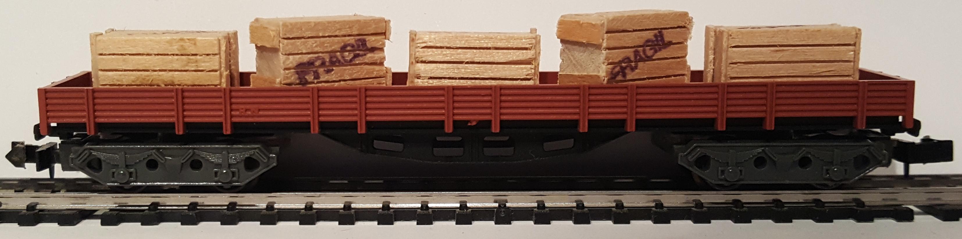 • Vagón de bordes bajos de cuatro ejes, color marrón, bajos marrones