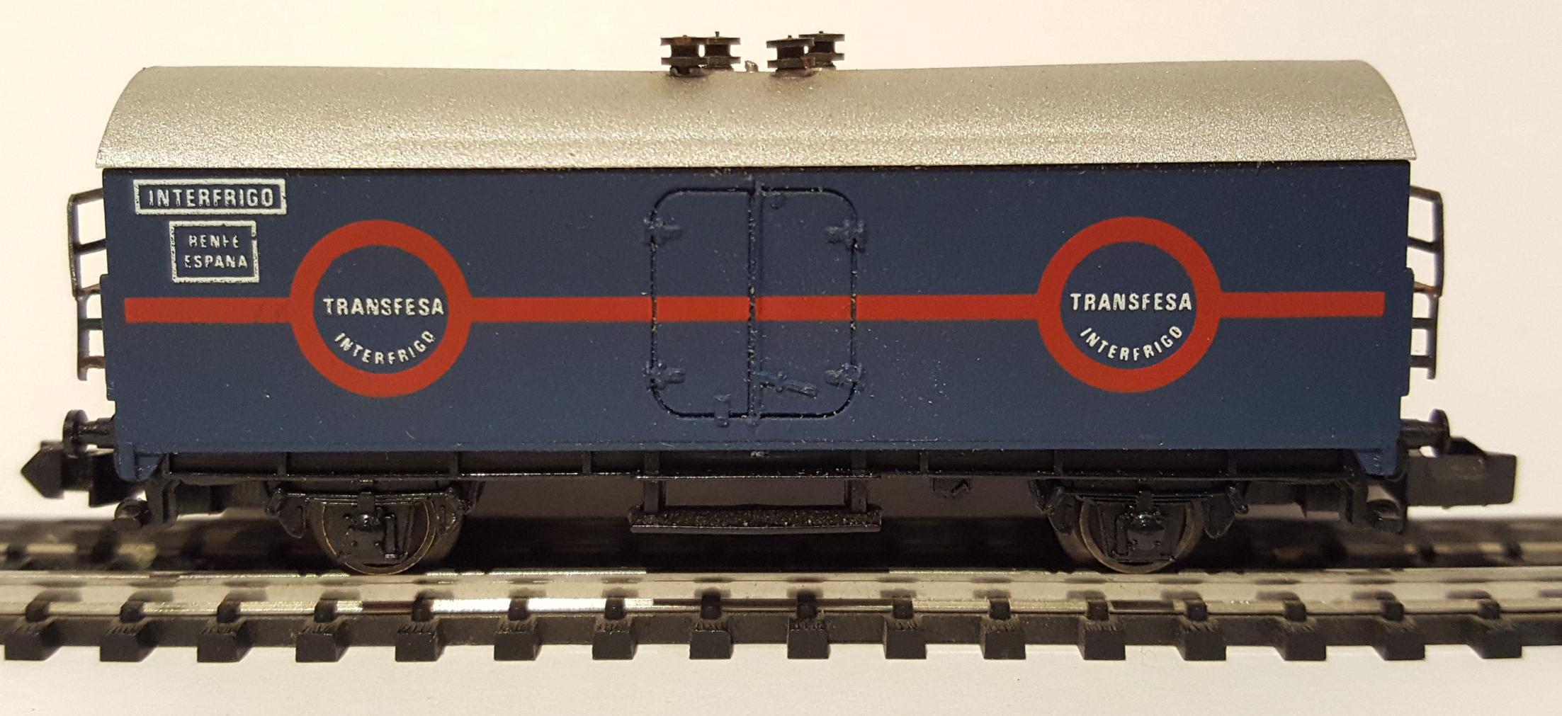 • Vagón frigorífico, de la compañía Transfesa, color azul