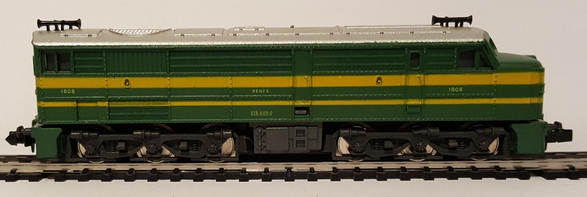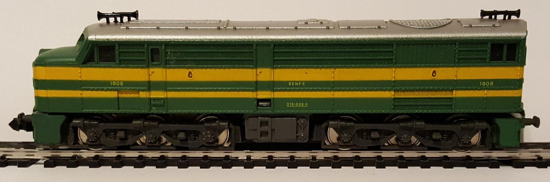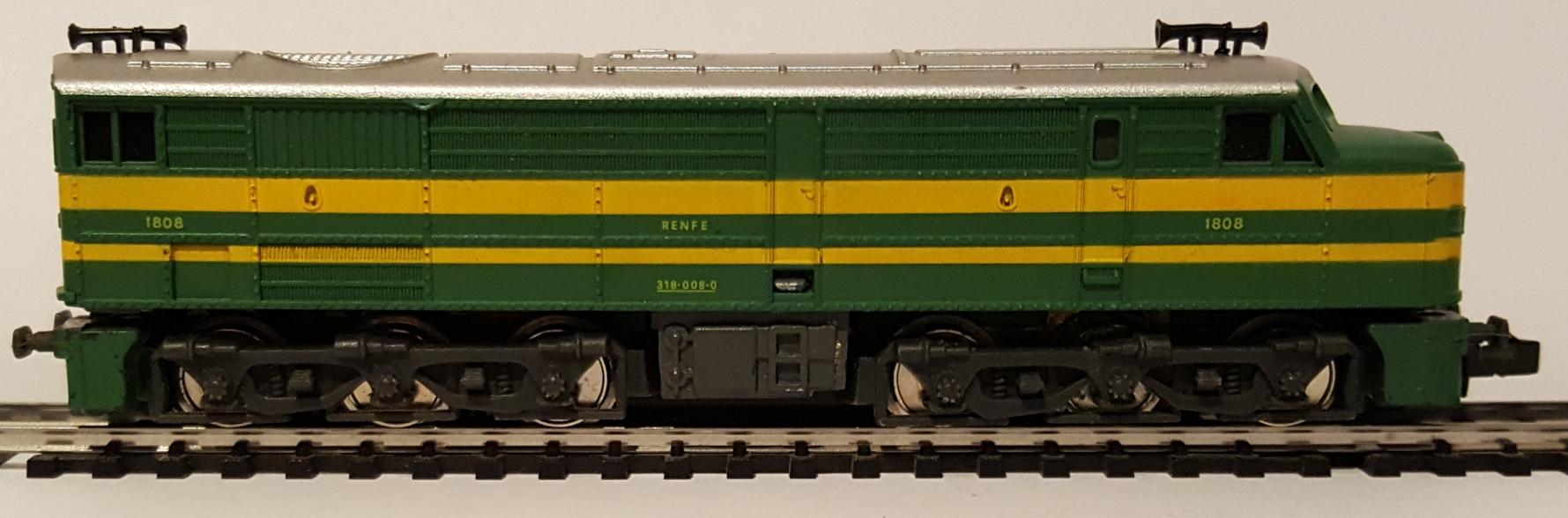 • Locomotora 318-008-0, de la compañía RENFE, Esquema verde con franjas amarillas